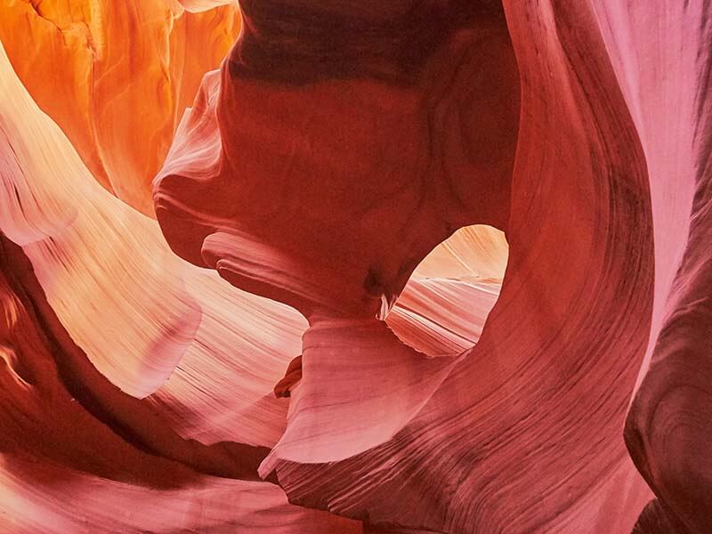 Los rayos de luz también brillan en Lower Antelope Canyon, pero no con tanta frecuencia. Esta sección también es más larga y profunda que el Upper Antelope Canyon. Es más difícil de atravesar, ya que los visitantes tienen que subir empinados tramos de escaleras y navegar por estrechos pasadizos. Sin embargo, algunas personas consideran que Lower Antelope Canyon es más divertido de explorar. Por eso lo incluimos exclusivamente en nuestra excursión de dos días por el Antelope Canyon y el Gran Cañón.