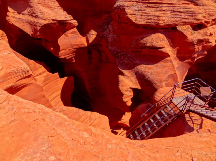 Lower Antelope Canyon has a set of stairs that lead into the canyon. There are 5 sets of stairs with about 70 steps in total. The third flight of stairs is steeper than most stairs, however, there are sturdy handrails on both sides to help you down.
