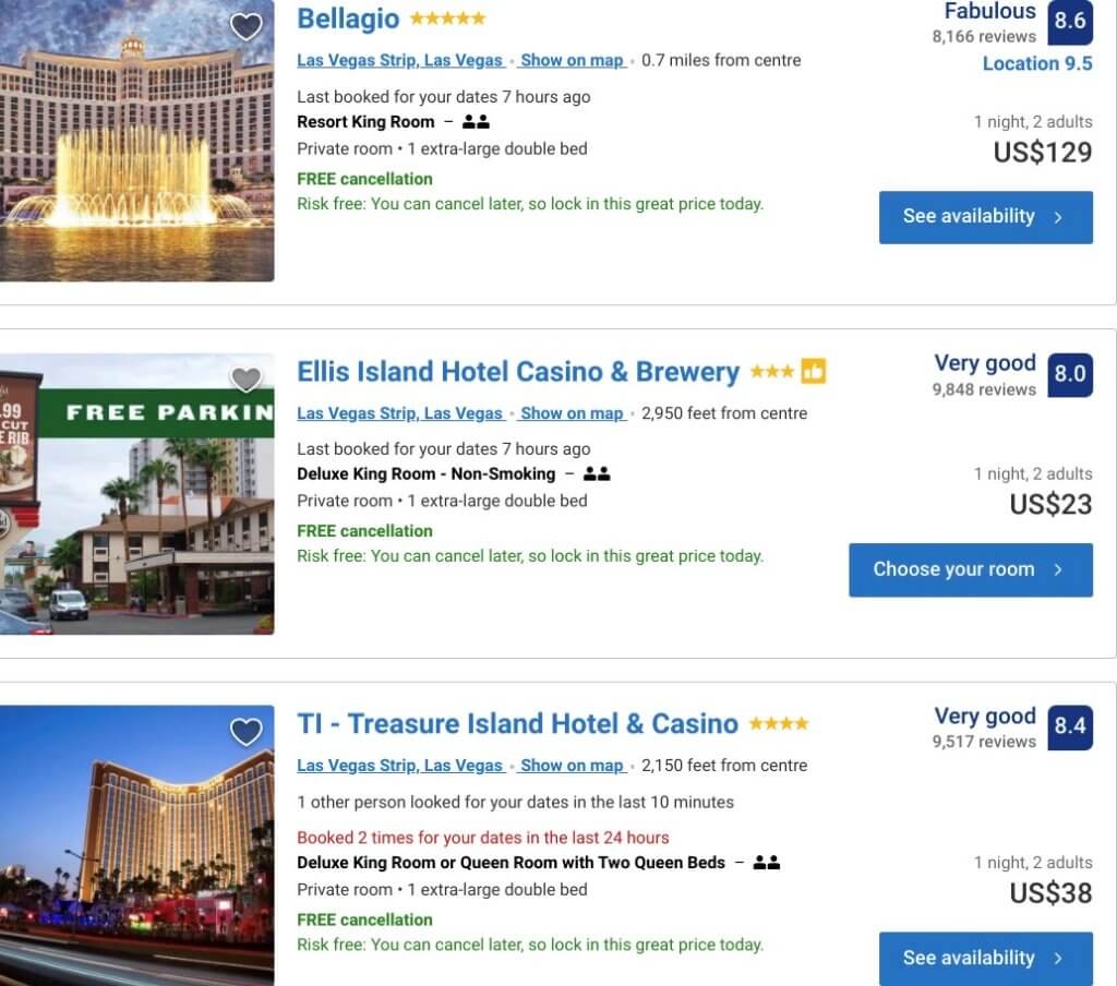 Taxes, fees, shipping charges and the such being added to our cart at checkout is typical for Americans. But rarely will you see the original price more than double at checkout, and that happens a lot in Las Vegas’ lower-end hotels. That $38 Treasure Island room above comes out to $87 at checkout.