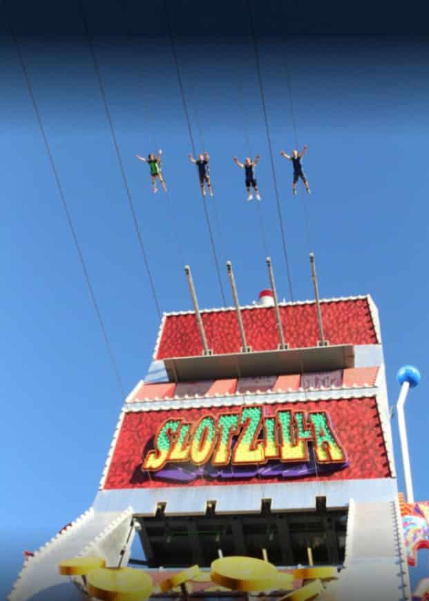Slotzilla位于弗里蒙特街(市中心的旧拉斯维加斯)。这是一种有趣的高空飞行体验,你会在近420米长的声光秀LED屏幕下飞行(位于弗里蒙特街上方27米)。声光秀表演是免费的,从黄昏到黎明都有表演。