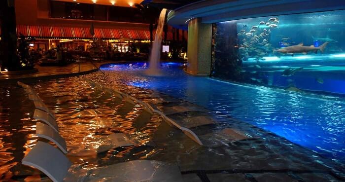 在拉斯维加斯市中心的Slotzilla索道旁边,你会看到水族箱泳池。这是弗里蒙特街目前最好的游泳池,很适合全家玩乐。游泳池周围是一个75万升以上的鲨鱼缸。还有一个水滑道可以带你穿过鲨鱼缸!